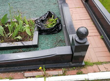 На нижеприведённых фотографиях представлен окончательный вид места захоронения. Мы поставили на место памятник, сделали цветник, уложили внутрь участка гранитную брусчатку. По периметру места захоронения проходит старый цоколь, на этот раз укреплённый на надёжное и добротное основание. В правую половину участка высадили две туи (одну в специальную клумбу, другую в пластиковую кадку), в цветник поместили барвинок. В таком виде объект был представлен клиенту, который остался очень доволен проделанной работой.